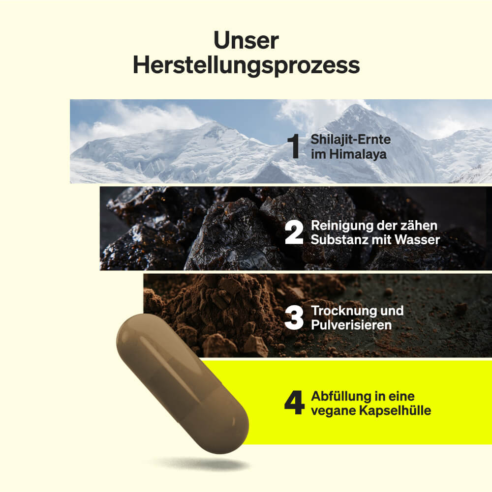 Statt des schwer zu dosierenden Harzes erhältst du hier hochwertiges Shilajit-Pulver in praktischen Kapseln –