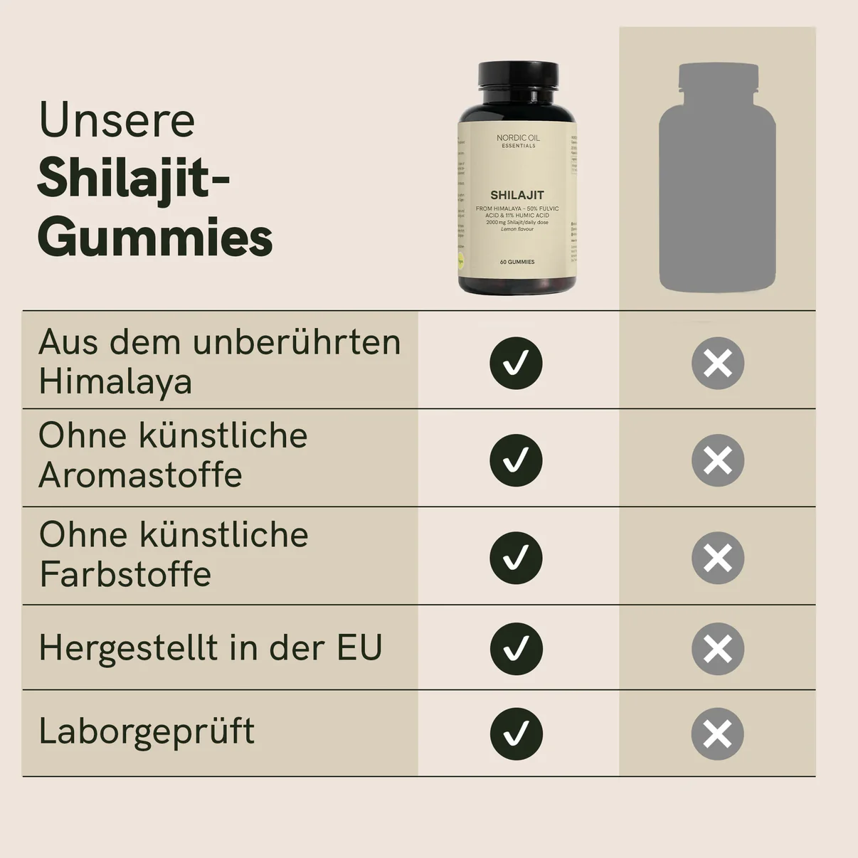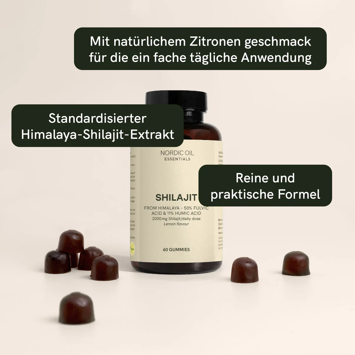 - Maximale Extrakt-Potenz: Hochreines Himalaya-Shilajit (50:1) – jedes Gummy entspricht 1.000 mg nativem Harz.