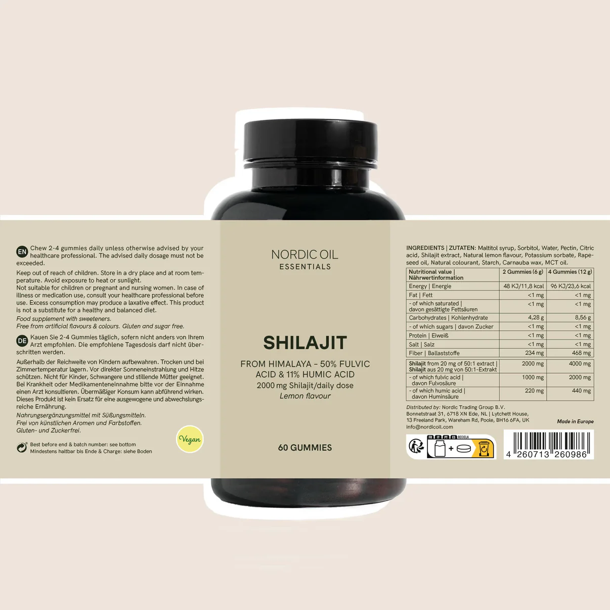 Premium-Inhaltsstoffe: Maltitolsirup, Sorbitol, Wasser, Pektin, Zitronensäure, Shilajit-Extrakt (50:1), natürliches Zitronenaroma, Kaliumsorbat, Rapsöl, natürlicher Farbstoff, Tapiokastärke, Carnaubawachs, MCT-Öl.